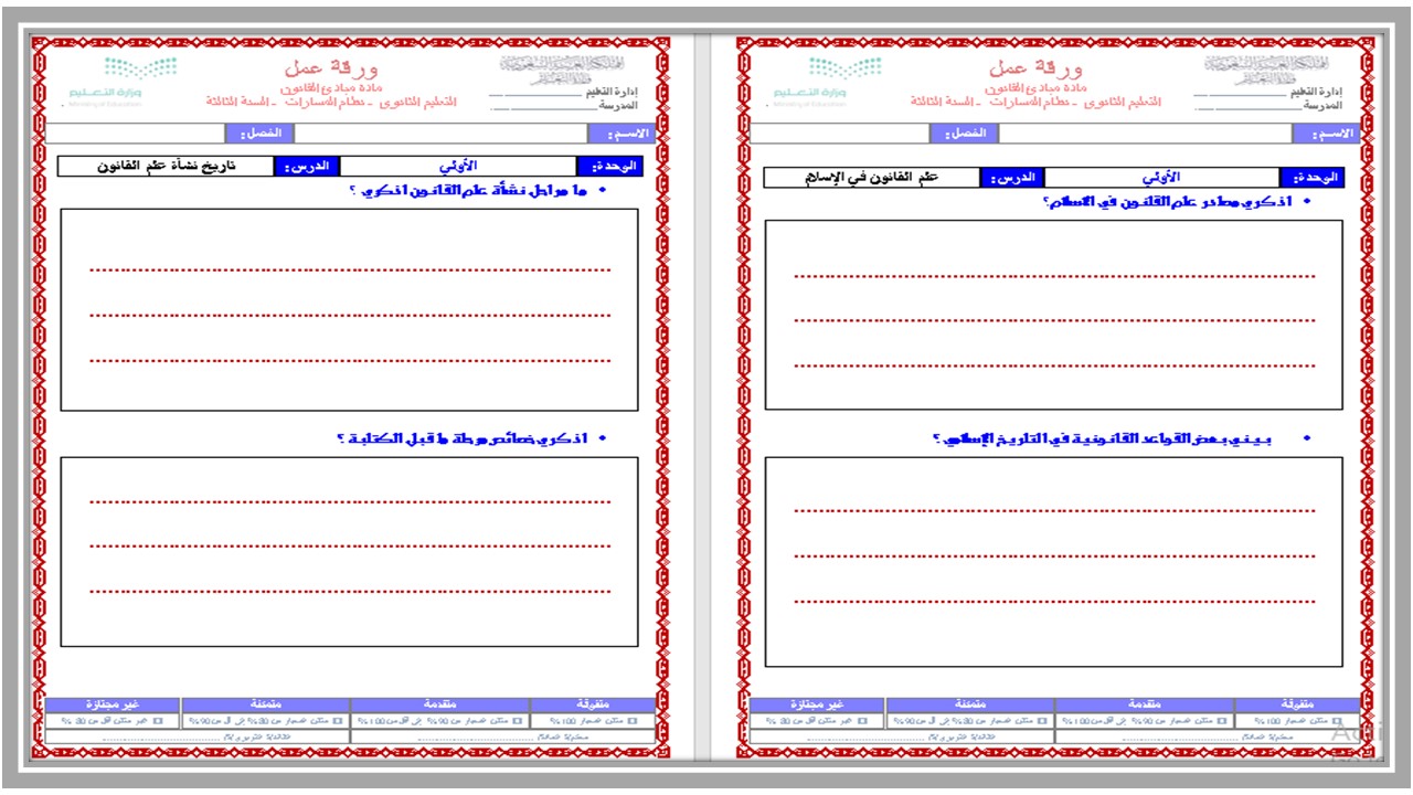 قامت مؤسسة التحاضير الحديثة بتصميم أوراق العمل بعناية فائقة تتناسب مع مختلف مستويات الطلاب فهي تحتوي على مجموعة من الأسئلة المتدرجة من حيث الصعوبة فإحدى المميزات الأساسية لتلك الأوراق هي تنوع الأسئلة التي تشمل جميع جوانب المادة القانونية كما تتيح هذه الأسئلة للمعلم الفرصة لتحديد نقاط القوة والضعف لدى الطلاب مما يسهل عليه تقديم الدعم المستمر للمساعدة في تحسين مستواهم الأكاديمي فمن خلال تلك الأسئلة يتم تحديد مستوى تحصيلهم ودرجة استيعابهم للمعلومات .