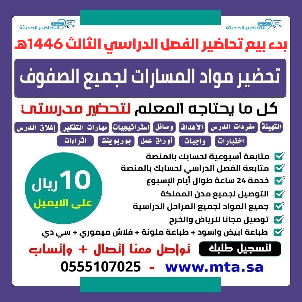 توزيع المنهج – تحضير منصة مدرستي – التحاضير الورقية الحديثة – أوراق العمل – عروض بوربوينت تفاعلية – حل اسئلة الكتاب – ملخصات واختبارات – كتاب الكتروني بصيغة pdf