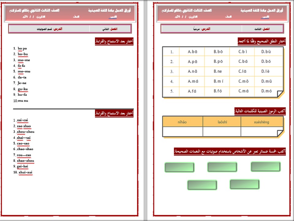أوراق عمل اللغة الصينية مسارات تقوم مؤسسة التحاضير الحديثة بتوفير ملفات تعليمية مميزة لمادة اللغة الصينية والتي تعتبر واحدة من أحدث المواد في مرحلة المسارات ، كما تقدم لهذه المادة العديد من الاستراتيجيات وطرق التعلم الحديثة التي يمكن تحقيق التقدم والنجاح من خلالها ، حيث تساعد على توسيع آفاق المعلم وتساعده على شرح الدروس وعرض المفردات الجديدة بصورة بسيطة ومبتكرة .