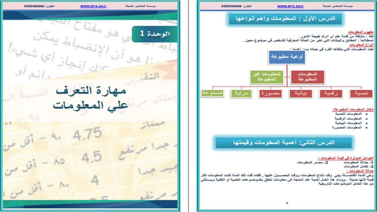تتناول مادة البحث ومصادر المعلومات مسارات أنواع المعلومات التي يتلقاها الفرد في حياته وأيضا اشكال المعلومات المطبوعة ومنها ( معلومات نصية – معلومات رقمية – معلومات بيانية – معلومات مصورة) . ولذلك تقدم المؤسسة أفضل طرق التحاضير والشرح المبسطة بطرق مختلفة المتنوعة التي تساعد المعلم على توصيل المعلومة للطلاب . كما تقدم المؤسسة خدمات إضافية للمعلمين والمعلمات : دعم شامل لجميع المراحل الدراسية ، من رياض الأطفال حتى الثانوي . كما تغطي خدماتنا المنصات التعليمية المعتمدة مثل : مدرستي، مزن، كلاسيرا، فيو كلاس، دارس .