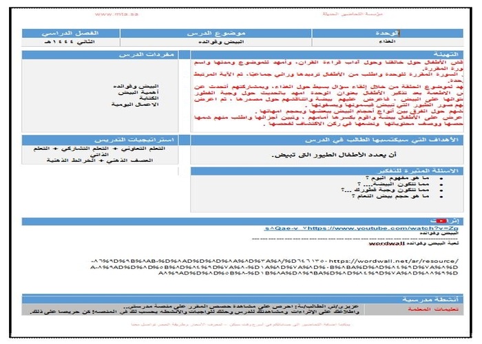 تحضير المنهج الوطني وحدة الغذاء رياض الأطفال