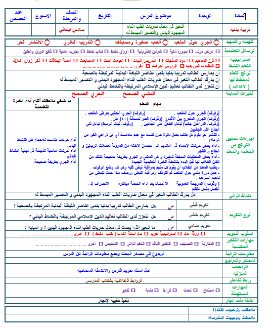 تحضير مادة تربية بدنية للصف السادس الابتدائي الفصل الدراسي الأول 1441