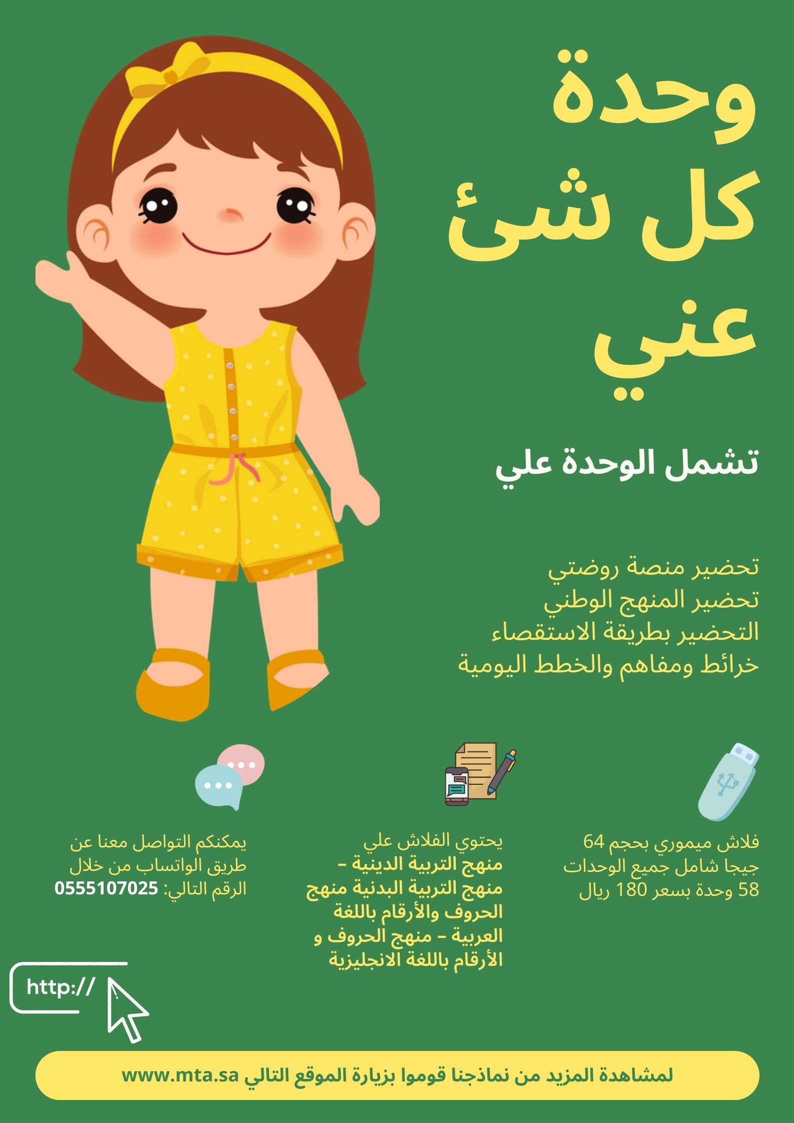 تحتوي الوحدة علي تحضير منصة روضتي ويشمل المرفقات التالية: (حروف باسمي – أشكالنا تتشابه وتختلف – يمكنني فعلها – اشيائي المفضلة – اصبحت كبيراً – جسمي – أنا اتحرك – التنفس – الحواس الخمسة – كيف نسمع الأصوات – الطعام الصحي – التمارين الرياضية – طبيب الأسنان – الجراثيم – السلامة في الطريق)
