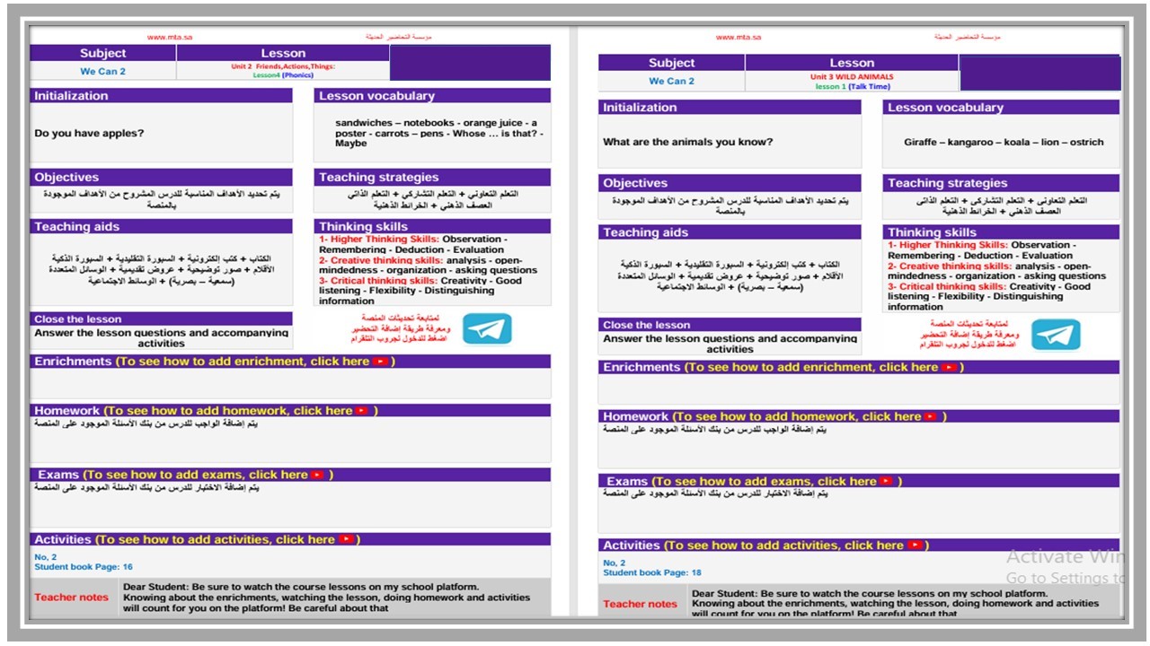 وبجانب هذه الطريقة نجحت المؤسسة أن توفر واحد من أهم الملفات الخاصة بالمادة وهو ملف التحضير ، ويتم إرساله كرابط معد بصيغة البي دي اف ، مما يتمكن المعلم من طباعته ونسخ ولصق الروابط المضافة به إلى حساب المعلم على المنصة .