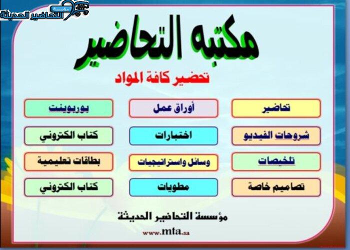 توفر لك مؤسسة التحاضير الحديثة جميع الملفات المتعلقة بمختلف المواد العلمية والأدبية لجميع الفصول الدراسية من خلال مكتب العرض والتحضير بالإضافة إلى صياغة العديد من الملاحق بأشكال أنيقة واستراتيجيات التعلم وعروض تقديمية احترافية في PowerPoint تساعد المعلم لاستخدام العملية التعليمية ، نقوم بتسليمها لك عن طريق البريد الإلكتروني ، وطباعتها وتسليمها أو الدورة كاملة على قرص مضغوط حتى تصل خدماتنا إلى جميع المعلمين .