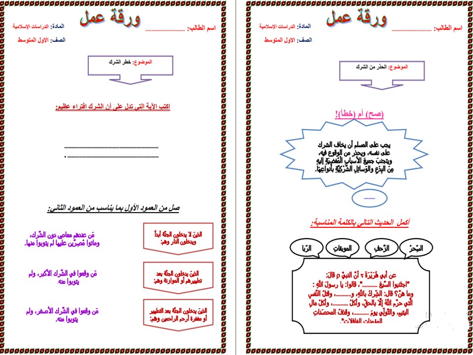 ورق عمل الدراسات الإسلامية اول متوسط الفصل الاول